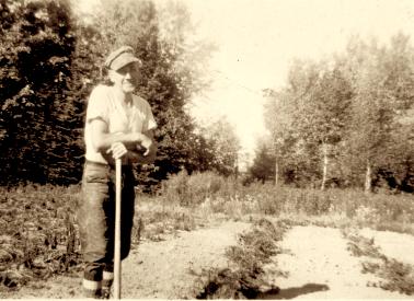 ![]() John Nelson at his berry patch. Moving to Little Sand Bay, he found employment as hired man to the three Hokenson brothers at their fishery. In those days, there was plenty of work for an extra set of hands in the fishing business. He helped unload the boats, repaired nets, cut lake ice in the winter. He cut and shaped poles for pound net stakes, and he carved chunks of sandstone into weights that helped hold the nets in position. The pay would not have been much, but Nelson's needs were simple; he was used to a rugged life. Having found work, his next order of business was to build himself a home. Nelson constructed a temporary, tar-papered shack not far from the slough which empties into Lake Superior just east of the Town of Russell parking lot. He stayed there several years while he cleared a nearby patch of land and set aside logs to build a bigger, better cabin. Some time around 1938, he completed the structure we see today. This seemingly nondescript cabin is worth a close look. Though built on the eve of World War II, its construction harks back to traditional Scandinavian methods. Nelson used no power tools in his work; each log was cut and shaped with axe and plane. The careful dovetail joints at the corners testify to his skill and care.